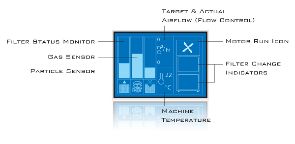 - Die Strömungsüberwachung erhöht automatisch die Drehzahl des Motors bei zunehmender Filtersättigung. Bei der Vakuumregelung wird der tasächlich benötigte Luftstrom überwacht