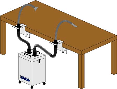 Ein bzw. zwei Saugschläuche mit Rohrdüsen konischen Hutzen oder Klarsichthaubenmit an flexiblen Edelstahlarmen können angeschlossen werden.